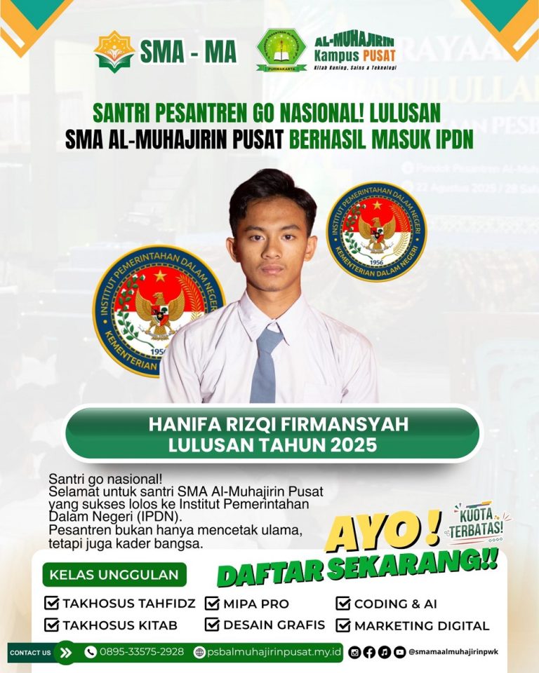 PendidikanKita– Kabar membanggakan datang dari SMA Al-Muhajirin Pusat. Salah satu santri terbaik, Hanifa Rizqi Firmansyah, resmi dinyatakan lolos seleksi Praja Institut Pemerintahan Dalam Negeri (IPDN) Tahun 2025.